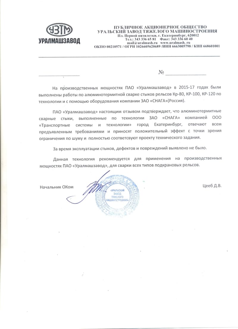 Алюминотермитные сварные стыки, выполненные по технологии ЗАО «СНАГА» компанией ООО «Транспортные системы и технологии» город Екатеринбург, отвечают всем предъявленным требованиями и приносят положительный эффект с точки зрения ограничения по шуму и полностью соответсвуют проекту технического задания.